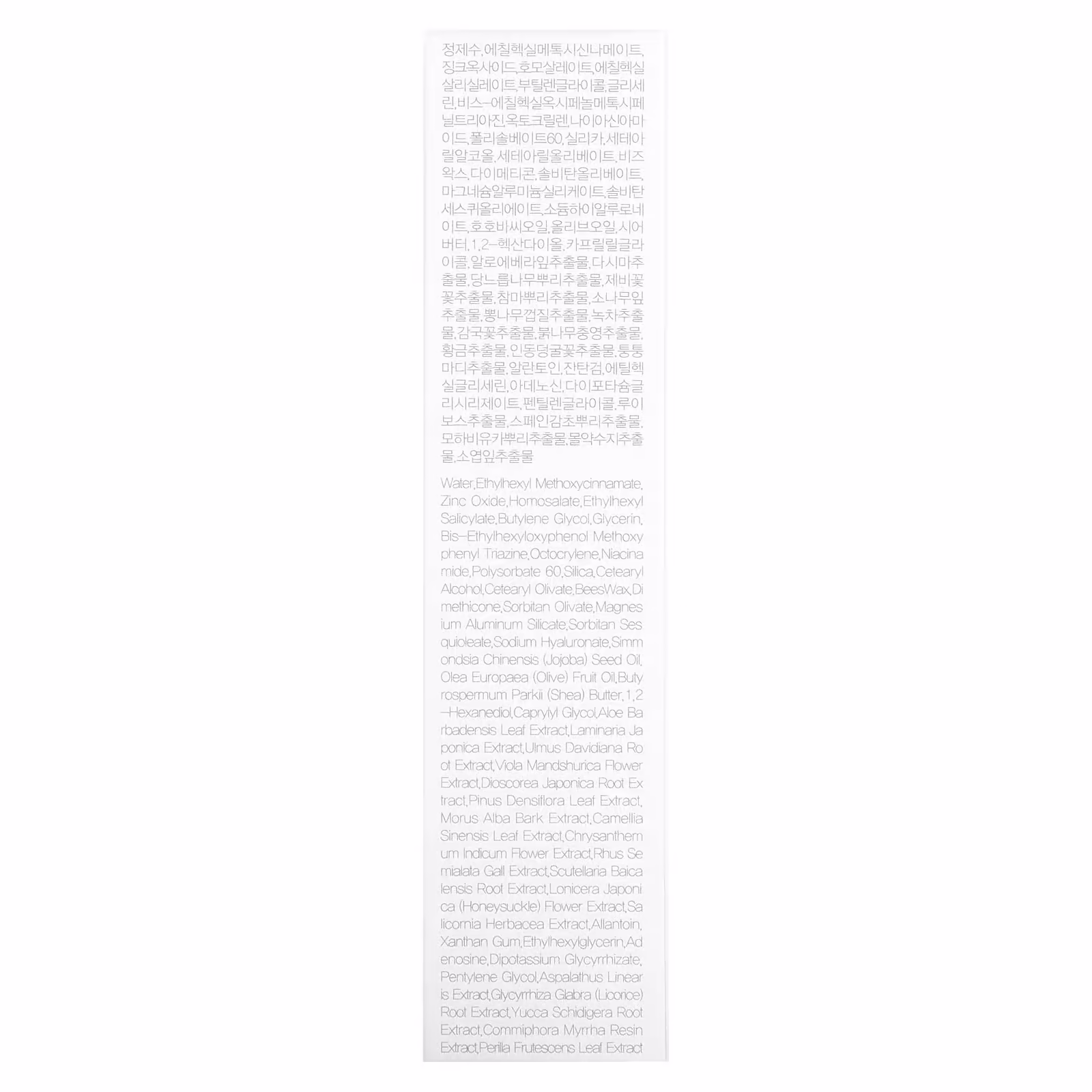 Water, ethylhexyl methoxycinnamate, zinc oxide, homosalate, ethylhexyl salicylate, butylene glycol, glycerin, bis-ethylhexyloxyphenol methoxyphenyl triazine, octocrylene, niacinamide, polysorbate 60, silica, cetearyl alcohol, cetearyl olivate, beeswax, dimethicone, sorbitan olivate, magnesium aluminum silicate, sorbitan sesquioleate, sodium hyaluronate, simmondsia chinensis (jojoba) seed oil, olea europaea (olive) fruit oil, butyrospermum parkii (shea) butter, 1,2 -hexanediol, caprylyl glycol, aloe barbadensis leaf extract, laminaria japonica extract, ulmus davidiana root extract, viola mandshurica flower extract, dioscorea japonica root extract, pinus densiflora leaf extract, morus alba bark extract, camellia sinensis leaf extract, chrysanthemum indicum flower extract, rhus semialata gall extract, scutellaria baicalensis root extract, lonicera japonica (honeysuckle) flower extract, salicornia herbacea extract, allantoin, xanthan gum, ethylhexylglycerin, adenosine, dipotassium glycyrrhizate, pentylene glycol, aspalathus linearis extract, glycyrrhiza glabra (licorice) root extract, yucca schidigera root extract, commiphora myrrha resin extract, perilla frutescens leaf extract.