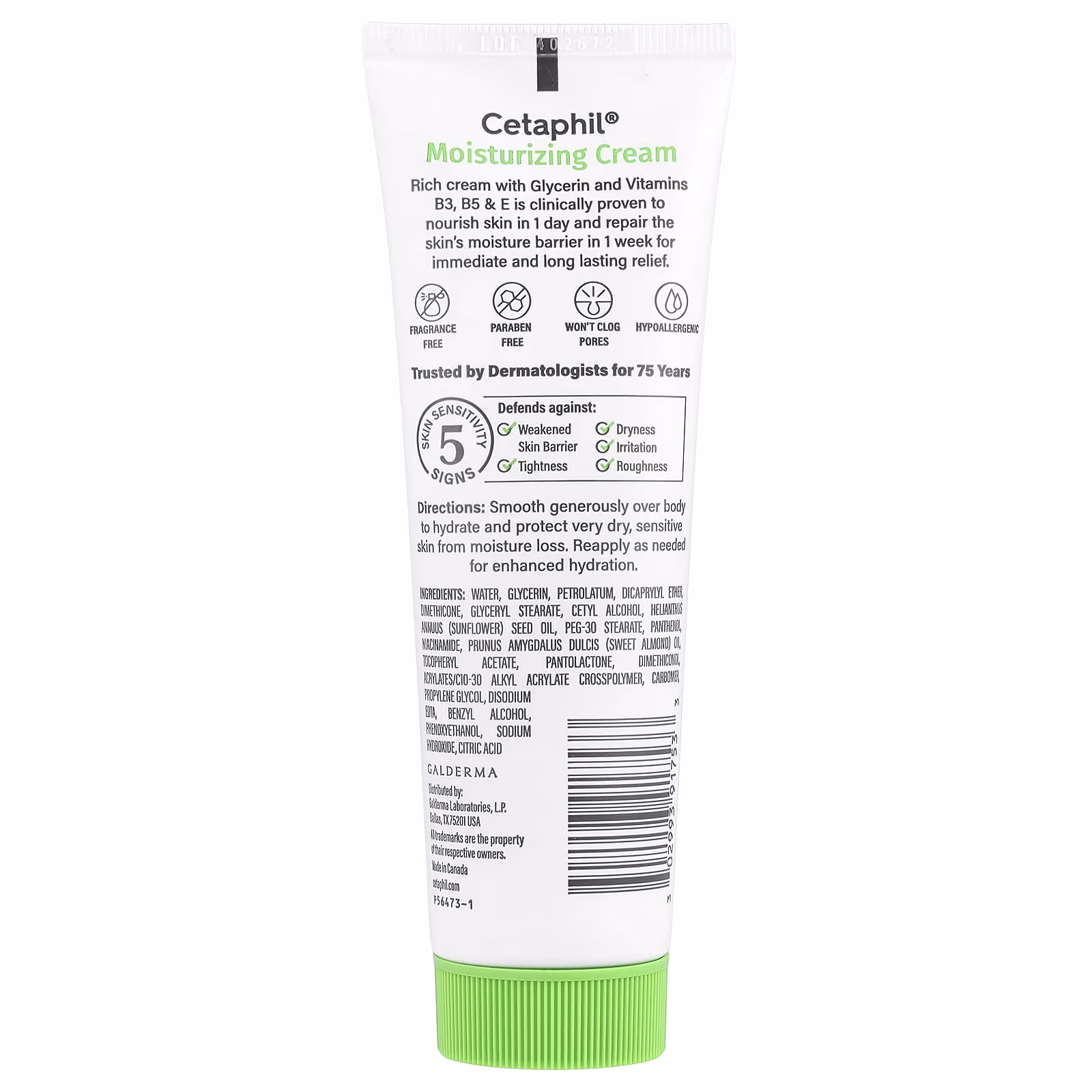 Rich cream with Glycerin and Vitamins B3, B5 & E is clinically proven to nourish skin in 1 day and repair the skin’s moisture barrier in 1 week for immediate and long lasting relief.