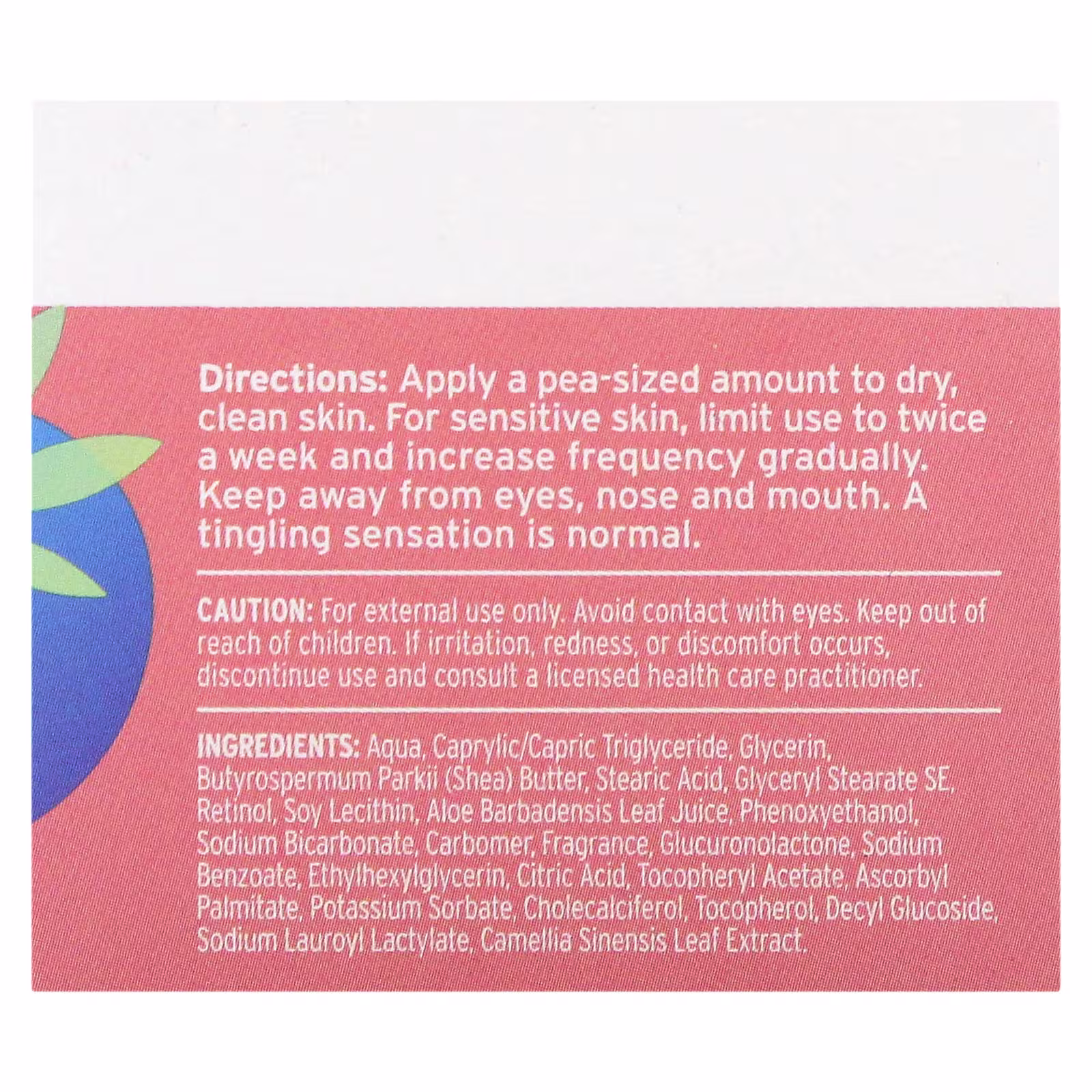 Apply a pea-sized amount to dry, clean skin. For sensitive skin, limit use to twice a week and increase frequency gradually. Keep away from eyes, nose and mouth. A tingling sensation is normal.